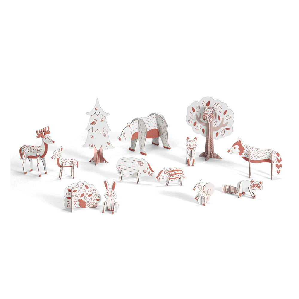 Ένα δημιουργικό σετ από 5 ταμπλό με προκομμένς φιγούρες, οι οποίες βγαίνουν, χρωματίζονται και συναρμολογούνται σε 3d ζωάκια του δάσους. Το παιδί παίζει με όλα τα στοιχεία που δημιουργήθηκαν και φτιάχνει παραμυθένιες ιστορίες. Περιλαμβάνονται οδηγίες.