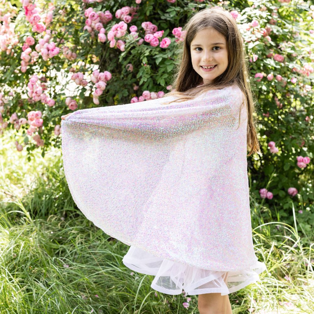 Η κάπα εφαρμόζει άνετα στους ώμους και προσφέρει ελευθερία κινήσεων. Οι ιριδίζουσες παγιέτες δημιουργούν εντυπωσιακή λάμψη σε κάθε βήμα. Η απαλή υφή εξασφαλίζει ότι το παιδί κινείται ελεύθερα ενώ νιώθει μοναδικό και ξεχωριστό.