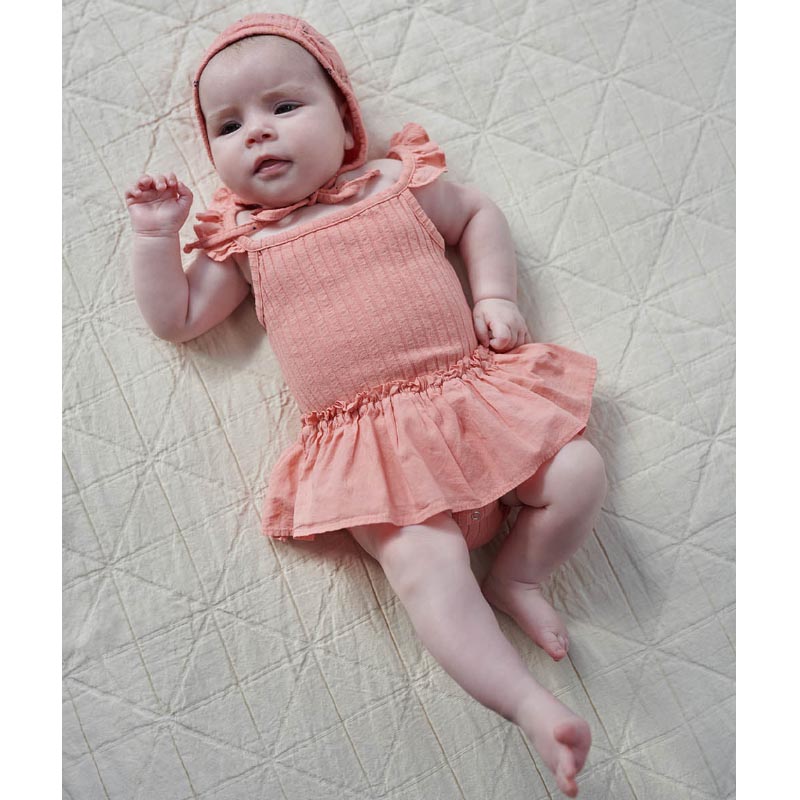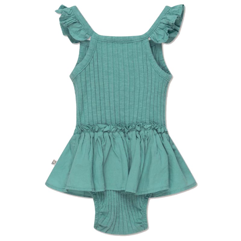 Πιο γλυκό δεν γίνεται! Οι όμορφες λεπτομέρειες κάνουν αυτό το κορμάκι με ριμπ ύφανση μοναδικό και κομψό. Αυτό το φορμάκι διαθέτει λεπτομέρειες με βολάν στις τιράντες, φούστα και άνοιγμα στο κάτω μέρος για έυκολη αλλαγή πάνας. Είναι κατασκευασμένο από 94% οργανικό βαμβάκι και 6% ελαστάνη και διαθέτει πιστοποίηση GOTS.