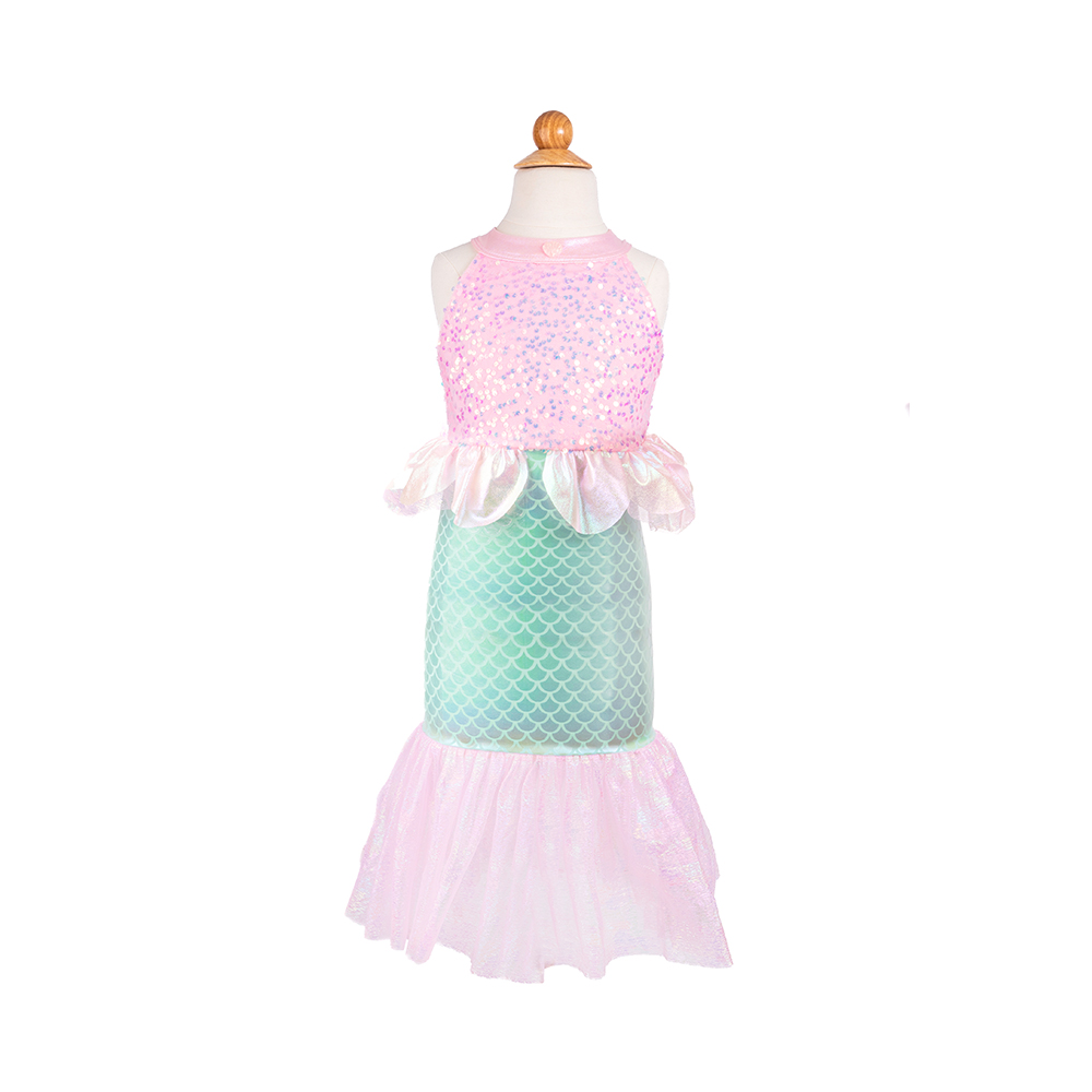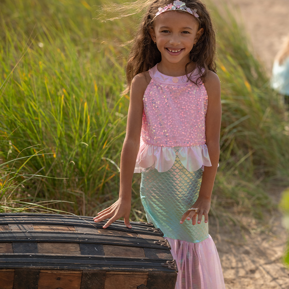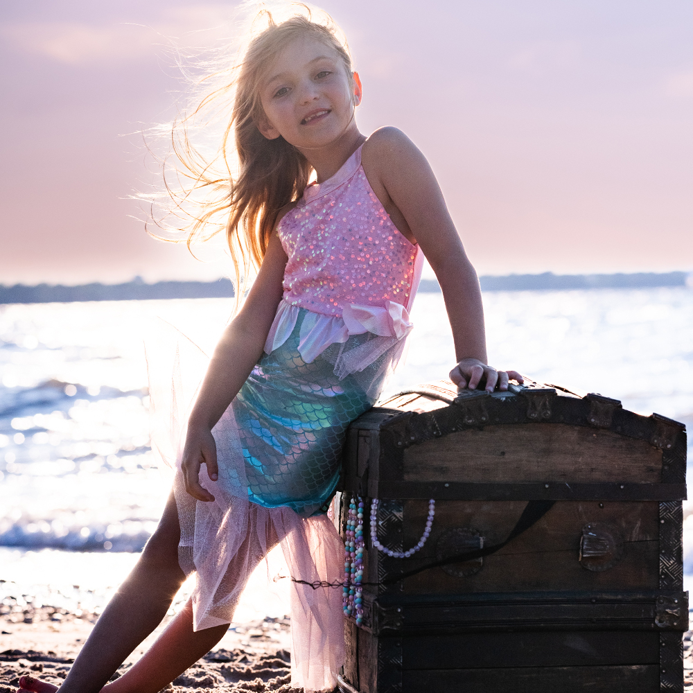 Γίνε η πρωταγωνίστρια κάθε θαλασσινής φαντασίας με το φόρεμα γοργόνας με πούλιες “Misty Mermaid” από τη Great Pretenders. Αυτό το μοναδικό σύνολο μεταμορφώνει κάθε κορίτσι σε λαμπερή γοργόνα, έτοιμη για παιχνίδι και περιπέτειες.