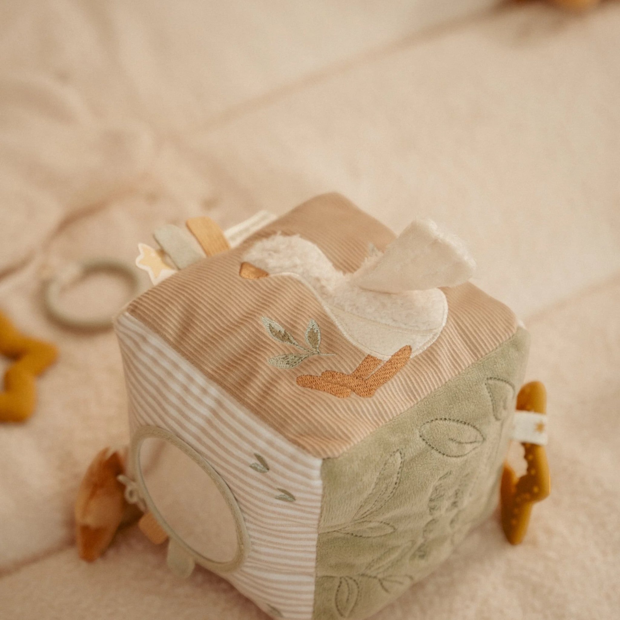 Ο Κύβος δραστηριοτήτων Newborn Naturals της Little Dutch μετατρέπει το παιχνίδι σε μια μοναδική εμπειρία εξερεύνησης. Κάθε πλευρά του κρύβει και μια μικρή έκπληξη: διαφορετικές υφές, ήχους, ετικέτες και έναν ασφαλή καθρέφτη που διεγείρουν τις αισθήσεις του μωρού. Το απαλό του ύφασμα και οι γήινες αποχρώσεις δημιουργούν μια ήρεμη αίσθηση, ιδανική για κάθε βρεφικό περιβάλλον.