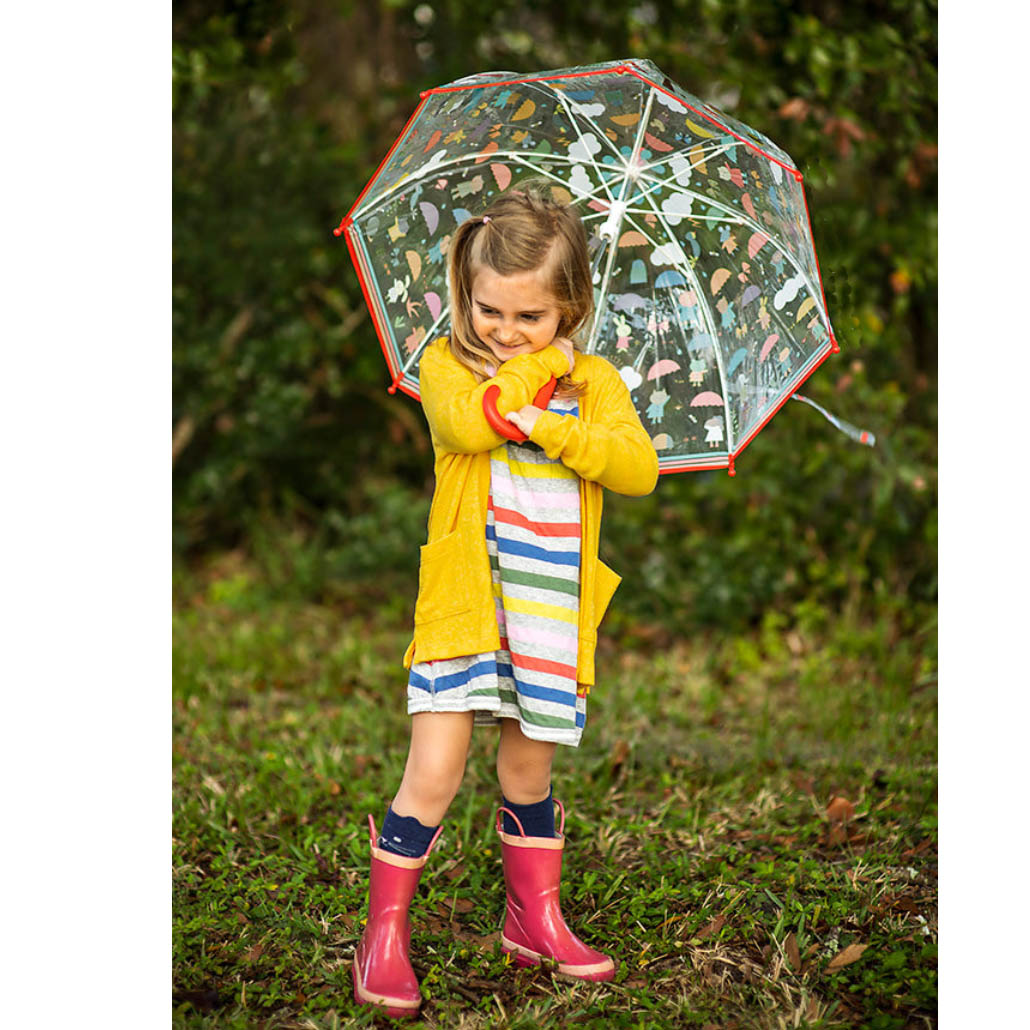 Παιδική ομπρέλα από την εταιρεία Djeco με υπέροχα μοτίβα, που «χρωματίζονται» όταν βρέχει. Το διάφανο PVC υλικό της ομπρέλας επιτρέπει στο παιδί να βλέπει και να παρατηρεί γύρω του, ενώ ο ψηλός θόλος της παρέχει περιμετρική προστασία από τη βροχή. Ο σκελετός της είναι από Fiberglass υλικό που τον κάνει γερό και ανθεκτικό. Ο τρόπος ανοίγματός προστατεύει τα δάχτυλα των μικρών μας φίλων. Τα πλαστικά καπάκια στις άκρες από τις ακτίνες, καθιστούν την ομπρέλα απόλυτα ασφαλή. Αυτή η χαρούμενη ομπρέλα θα ομορφύνει σίγουρα τις βροχερές και μουντές μέρες!