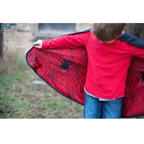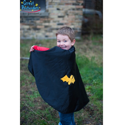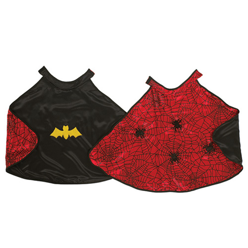 Κάπα και μάσκα διπλής όψης από την εταιρεία Great Pretenders για μεταμορφώσεις στο λεπτό! Τώρα οι μικροί μας φίλοι μπορούν να γίνουν άνθρωπος αράχνη ή νυχτερίδα, απλά και μόνο γυρίζοντας την πλευρά της κάπας, για ατελείωτες ώρες παιχνιδιού. Προσαρμόζεται εύκολα με βέλκρο στο λαιμό και έχει ύψος περίπου 55 εκατοστά. Κατασκευασμένη από μαλακό ύφασμα με σατέν όψη, θα γίνει η καλύτερη συντροφιά για το μαγικό ταξίδι στη φαντασία.