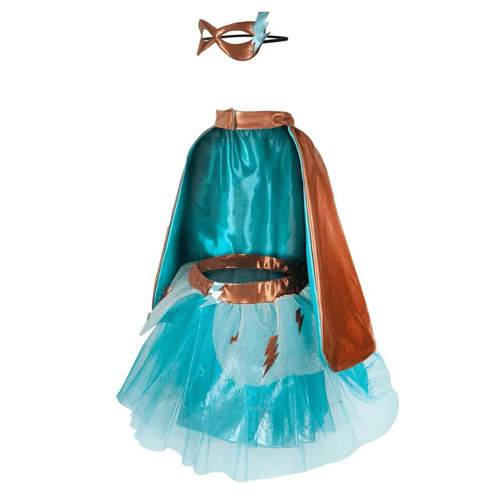 Στολή Σούπερ ηρωίδα ή ροκ σταρ της εταιρίας Great Pretenders, που αποτελείται από εντυπωσιακή φούστα τουτου με κεραυνούς και συνοδεύεται με κάπα και μάσκα που μπορούν να φορεθούν κι από τις δύο όψεις, αλλάζοντας το χρώμα τους (τιρκουάζ ή μπρονζέ)! Η στολή είναι εξαιρετικής ποιότητας και αποτελείται από υφάσματα και υλικά διαφόρων υφών, όπως τούλι, μεταλλιζέ ύφασμα και χρυσόσκονες, που προσδίδουν ένα εντυπωσιακό αποτέλεσμα. Είναι κατάλληλη για τις απόκριες, αλλά και για όλη τη διάρκεια του χρόνου. Μέσα από τις μεταμφιέσεις και τα παιχνίδια ρόλων τα παιδιά μαθαίνουν να εκφράζονται, αναπτύσσουν το λόγο τους και απελευθερώνουν τη φαντασία τους!