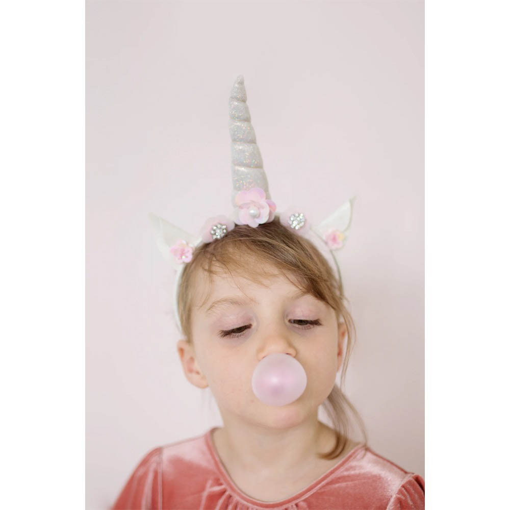 Πανέμορφη και εντυπωσιακή στέκα μαλλιών “Μονόκερος” από την εταιρεία Great Pretenders για τις μικρές μας φίλες. Ο σκελετός της στέκας είναι τυλιγμένος με γκλίτερ ύφασμα και είναι διακοσμημένη από λουλούδια με στρας και πέρλες. Στο κέντρο της δεσπόζει το επιβλητικό κέρατο του μονόκερου και στα πλάγια έχει χαριτωμένα αυτάκια.
