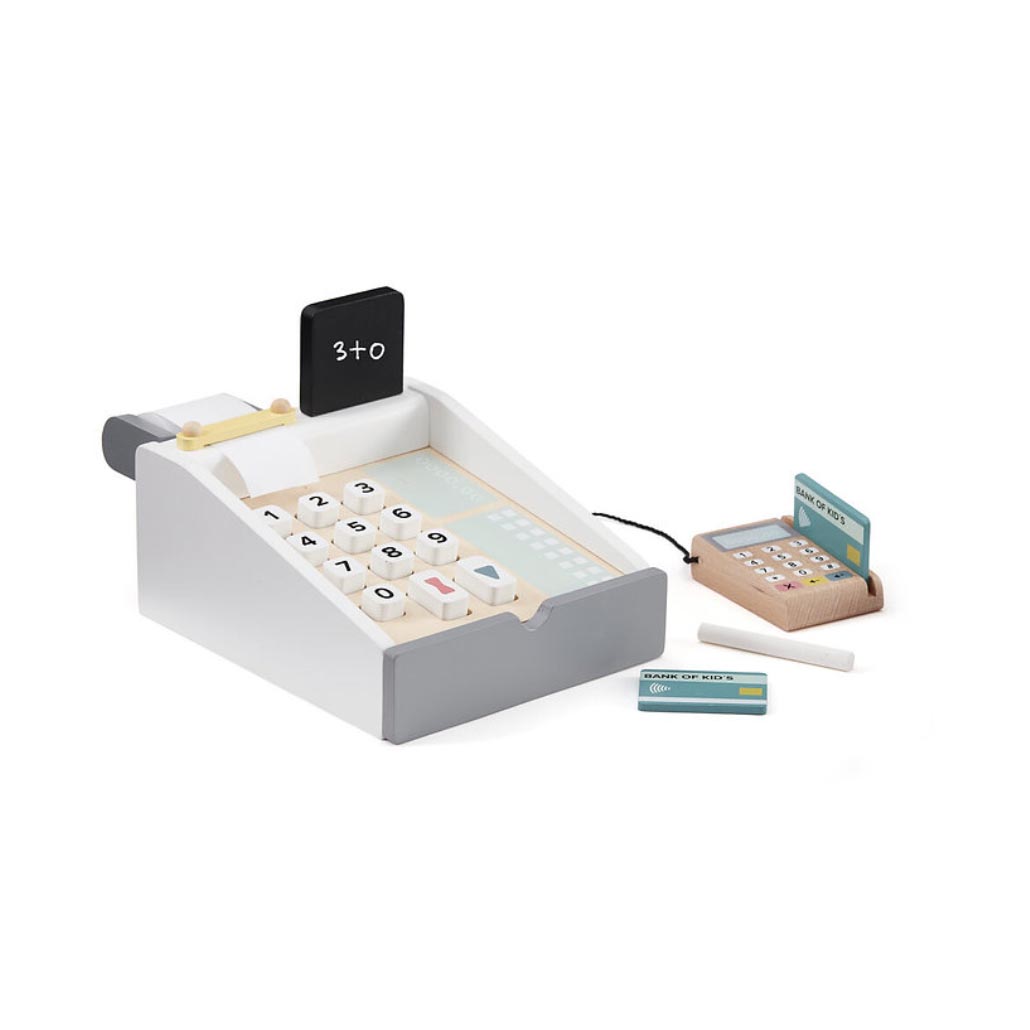 Υπέροχο ξύλινο ταμείο για διασκεδαστικά παιχνίδια ρόλων. Το σετ περιλαμβάνει ταμειακή μηχανή με κουμπιά, πίνακα για την καταγραφή τιμών, κομμάτι λευκής κιμωλίας και μηχάνημα καρτών με δύο κάρτες.