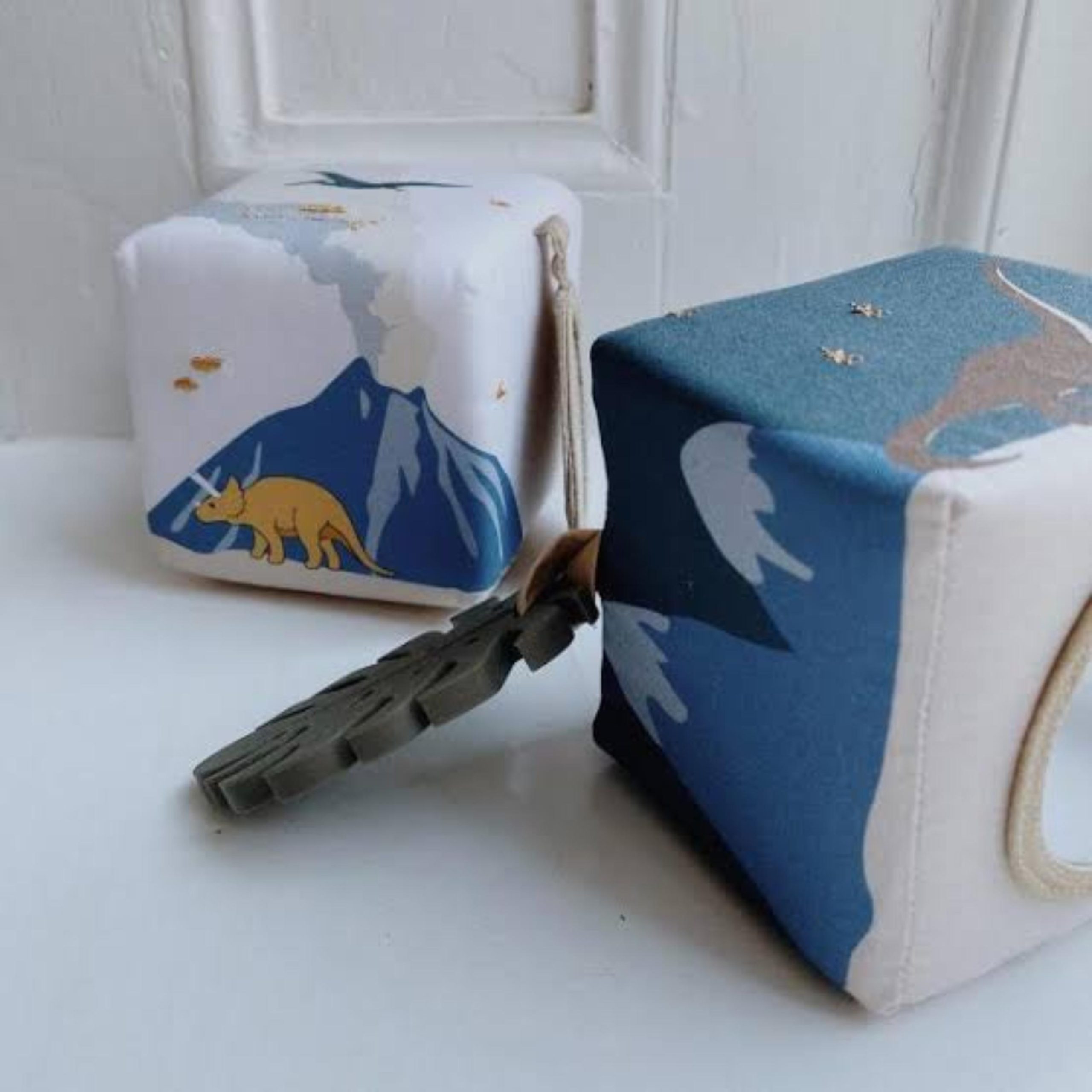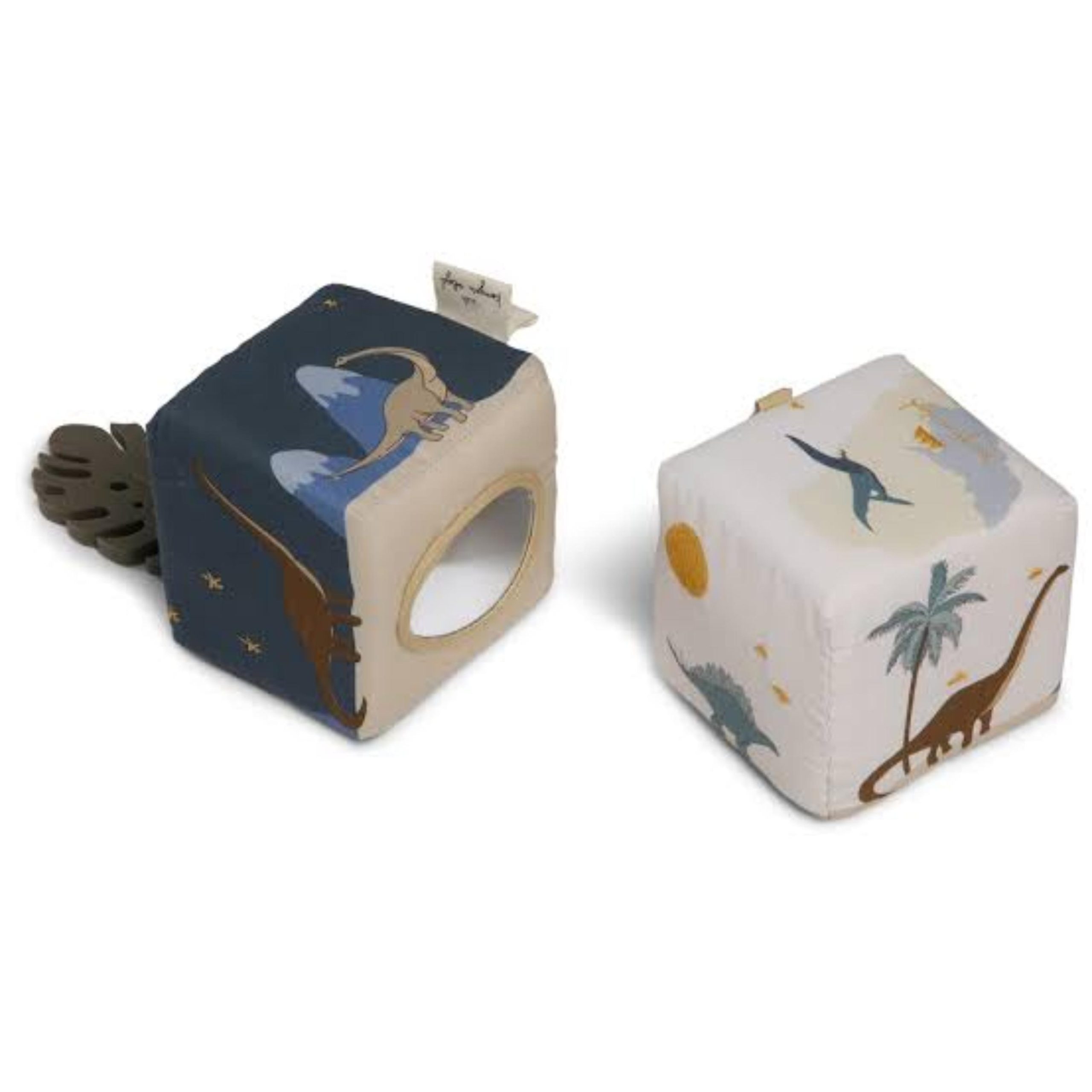 Υφασμάτινοι κύβοι που κρύβουν διάφορες εκπλήξεις που προκαλούν το μωράκι σας να ανακαλύψει! Καθρεφτάκι, ένα φύλλο από σιλικόνη για τους πόνους οδοντοφυίας, ένα εσωτερικό κουδουνάκι και ανάγλυφοι δεινόσαυροι.