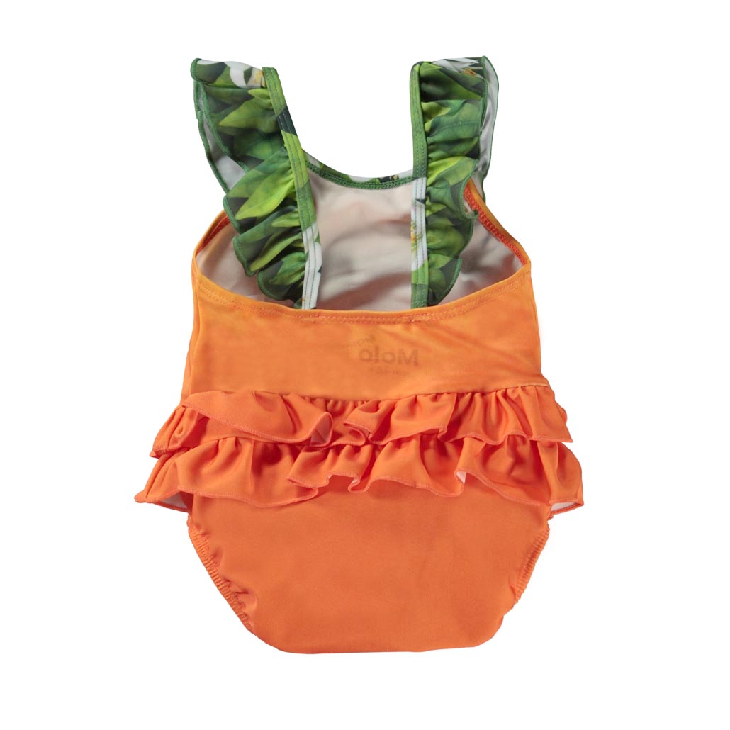 Το Orange είναι ένα βρεφικό μαγιό με βολάν στη μέση και στις τιράντες, σε πορτοκαλί χρώμα και μοιάζει με πορτοκάλι με πράσινα λουράκια και φλοράλ στάμπα. Τα μαγιό της Molo έχουν 50+ προστασία UV. Αυτό το προϊόν περιέχει τουλάχιστον 50% πολυεστέρα πιστοποιημένο με GRS που ανακυκλώνεται από απόβλητα μετά την κατανάλωση και είναι πιστοποιημένο από την Ecocert Greenlife, Αριθμός Άδειας. 19749