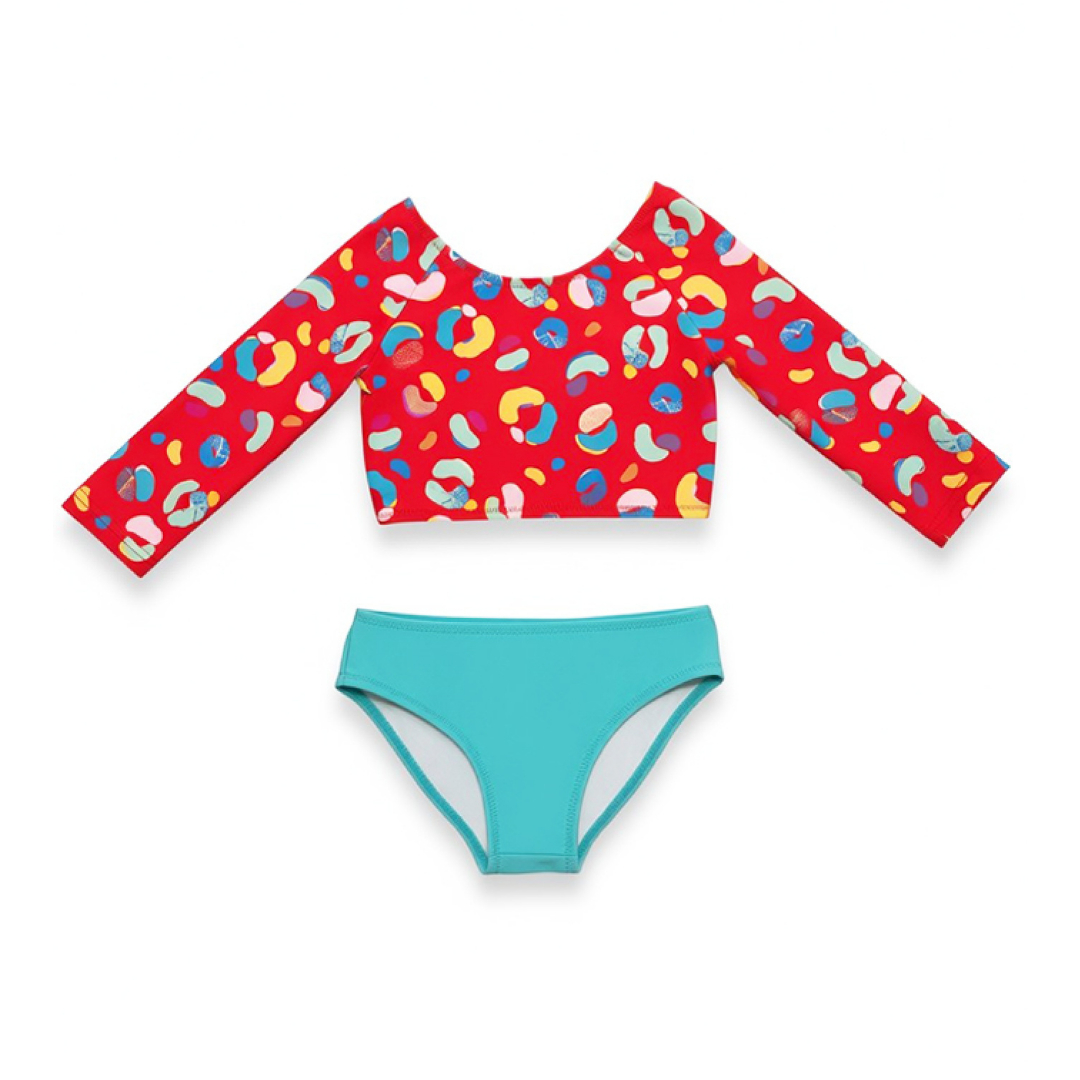 Το επάνω μέρος του Two Pieces Swimsuit- Red Leopard είναι crop top με μακριά μανίκια. Δένει με κόμπο είτε μπροστά είτε πίσω, χαρίζοντας άνεση και στυλ. Το κάτω μέρος αγκαλιάζει όμορφα το σώμα, προσφέροντας σταθερότητα και ελευθερία κινήσεων.